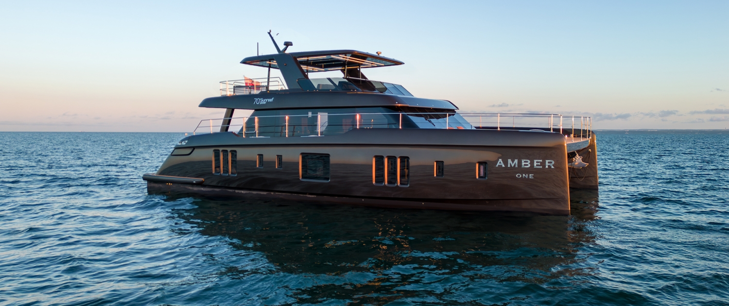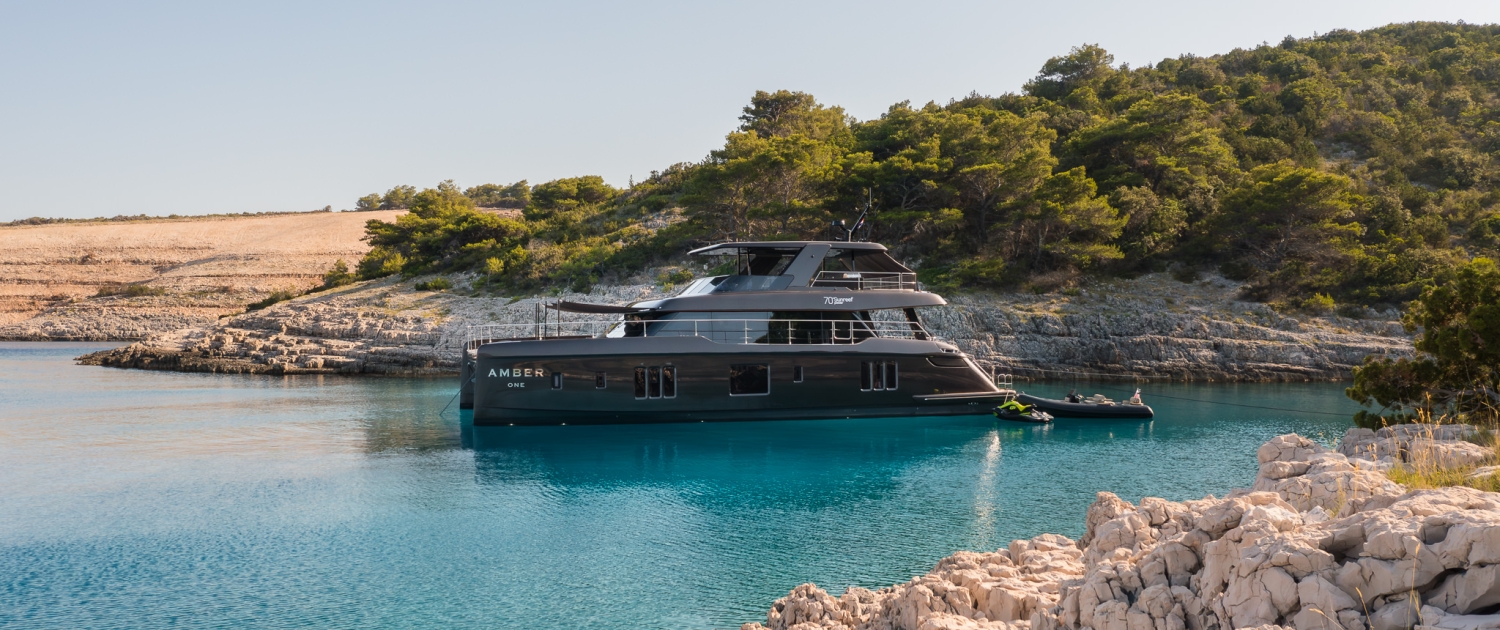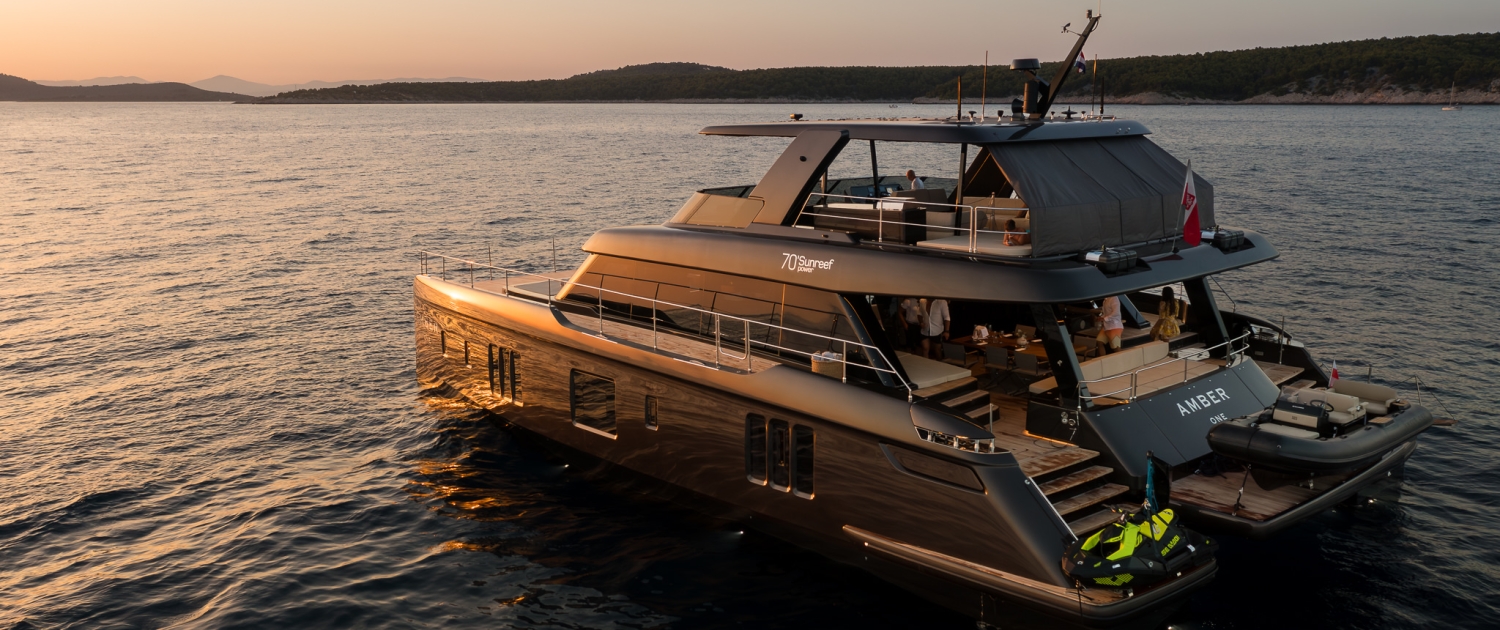 Charter Sunreef 70 POWER in Croatia. The 70 Sunreef Power continues the legacy of Sunreef Yachts’ seaworthy motor yachts. The Sunreef 70 AMBER ONE is an all-around sailing leisure yacht ideal for exclusive getaways and adventures. This model boasts a combination of exterior and interior areas easily flowing into one another. A clever bridge deck and superstructure design allow for a superior level of comfort onboard whereas the generous teak use, high bulwarks, and graceful lines underscore her modern style with a classic edge. The vast main deck saloon of the 70 Sunreef Power blends seamlessly with the aft cockpit, creating a large, semi-open dining and sunning area. The skylight, panoramic glazing, and wide sliding door let plenty of sunshine in. The 70 Sunreef Power boasts a large bow terrace for lounging protected from sun and wind. The aft cockpit provides an alfresco dining space close to the water as well as a great spot to enjoy water sports with easy access to toys and PWCs.